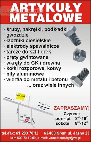 Oferujemy śruby, podkładki, nakrętki (także ze stali nierdzewnej), wkręty do drewna i blachowkręty, wkręty do płyt g-k, gwoździe budowlane i ciesielskie, elektrody i drut spawalniczy, tarcze do szlifierek, groty do wkrętarek, kołki rozporowe, kotwy metalowe oraz wiele innych.